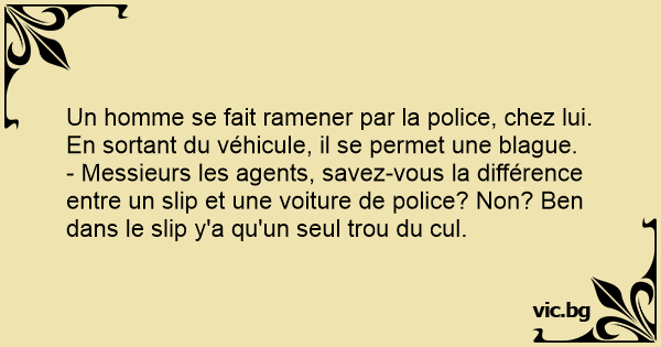 - Messieurs les agents, savez-vous la différence entre un slip et une voiture de police? Non? Ben dans le slip y'a qu'un seul trou du cul.