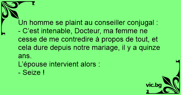 - C’est intenable, Docteur, ma femme ne cesse de me contredire à propos de tout, et cela dure depuis notre mariage, il y a quinze ans.