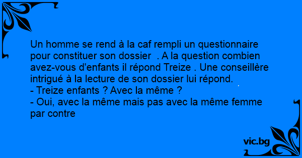 Un homme se rend à la caf rempli un questionnaire pour constituer son dossier . A la question combien avez-vous d'enfants il répond Treize . Une conseillère intrigué à la lecture de son dossier lui répond.
