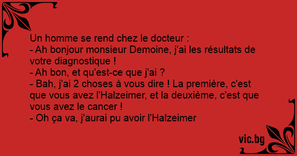 - Bah, j'ai 2 choses à vous dire ! La première, c'est que vous avez l'Halzeimer, et la deuxième, c'est que vous avez le cancer !