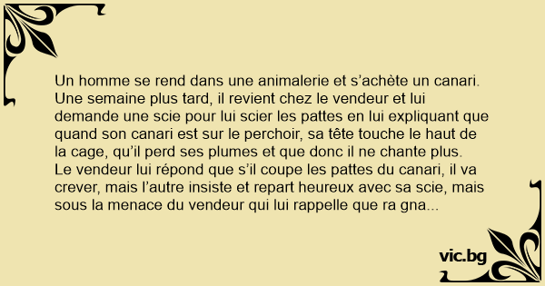 Une semaine plus таrd, il revient chez le vendeur et lui demande une scie pour lui scier les pattes en lui expliquant que quand son canari est sur le perchoir, sa tête touche le haut de la cage, qu’il perd ses plumes et que donc il ne chante plus.