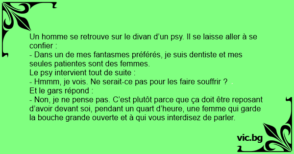- Dans un de mes fantasmes préférés, je suis dentiste et mes seules patientes sont des femmes.