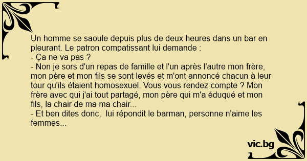 - Et ben dites donc, lui répondit le barman, personne n'aime les femmes dans votre famille ?