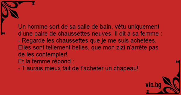 Un homme sort de sa salle de bain, vêtu uniquement d'une paire de chaussettes neuves. Il dit à sa femme :