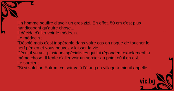 C'est un gars qui a un pénis de 50 cm, ce qui n'est pas pratique dans la vie de tout les jours. Il en parle à un de ses collègue qui lui répond d'aller en parler à la sorcière du village. Il va la...
