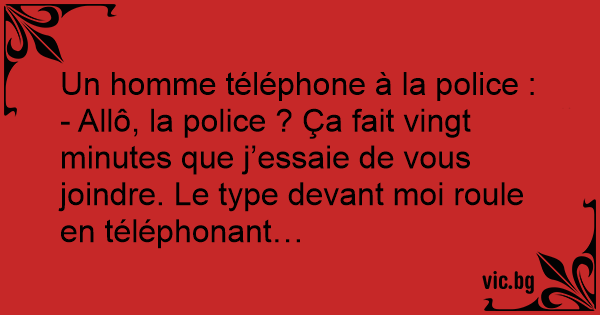 - Allô, la police ? Ça fait vingt minutes que j’essaie de vous joindre. Le type devant moi roule en téléphonant…