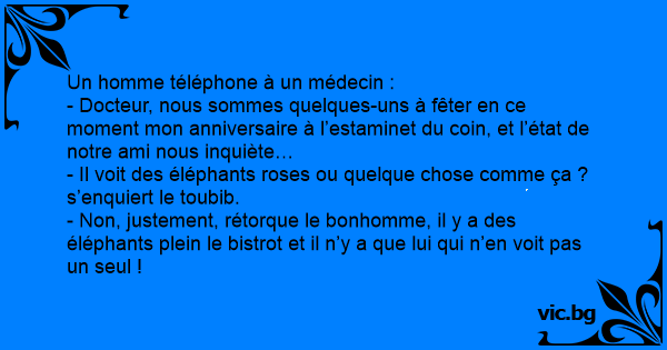 - Non, justement, rétorque le bonhomme, il y a des éléphants plein le bistrot et il n’y a que lui qui n’en voit pas un seul !