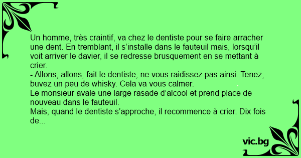 Un homme, très craintif, va chez le dentiste pour se faire arracher une dent. En tremblant, il s’installe dans le fauteuil mais, lorsqu’il voit arriver le davier, il se redresse brusquement en se mettant à crier.