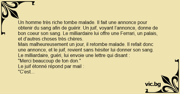 Mais malheureusement un jour, il retombe malade. Il refait donc une annonce, et le juif, revient sans hésiter lui donner son sang.