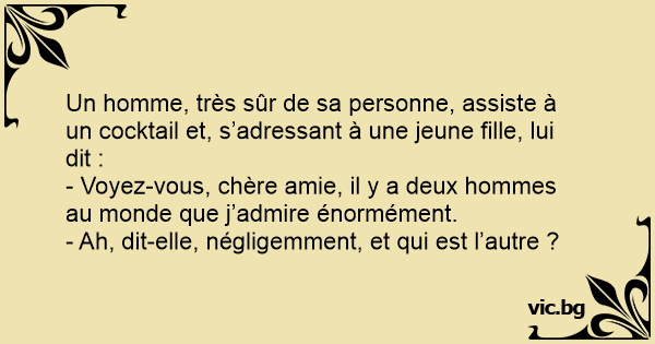 Un homme, très sûr de sa personne, assiste à un cocktail et, s’adressant à une jeune fille, lui dit :