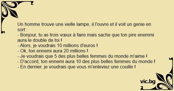 - Bonjour, tu as trois vœux à faire mais sache que ton pire enemmi aura le double de toi !