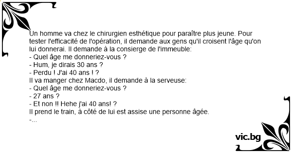 Alder En mand beslutter at få en ansigtsløftning på sin fødselsdag. Han bruger 30.000 kr. og synes rigtig godt om det færdige resultat. På vej hjem fra klinikken stopper han ved en kiosk og køber...