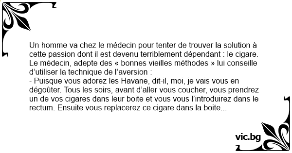 - Puisque vous adorez les Havane, dit-il, moi, je vais vous en dégoûter. Tous les soirs, avant d’aller vous coucher, vous prendrez un de vos cigares dans leur boite et vous vous l’introduirez dans le rестuм. Ensuite vous replacerez ce cigare dans la boite et vous remuerez le tout de telle manière que vous n’arriviez plus à distinguer lequel de tous les cigares vous avez déjà utilisé. Il est évident que de cette manière, vous n’oserez plus fumer aucun cigare, de peur de fumer le mauvais !