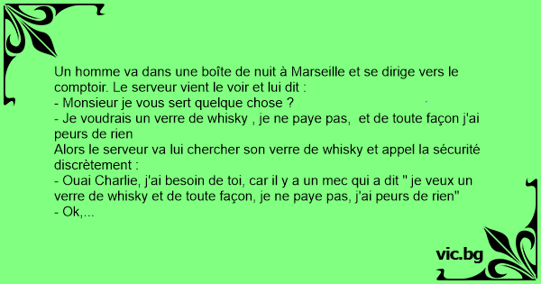 Un homme va dans une boîte de nuit à Marseille et se dirige vers le comptoir. Le serveur vient le voir et lui dit :