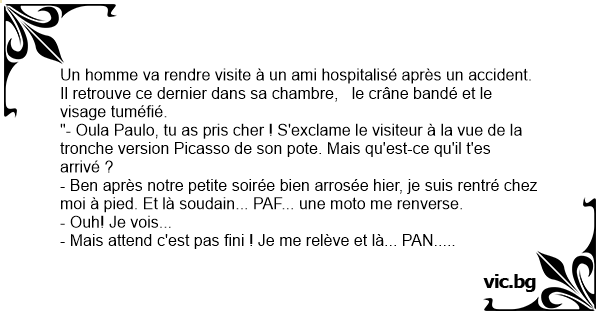 "- Oula Paulo, tu as pris cher ! S'exclame le visiteur à la vue de la tronche version Picasso de son pote. Mais qu'est-ce qu'il t'es arrivé ?