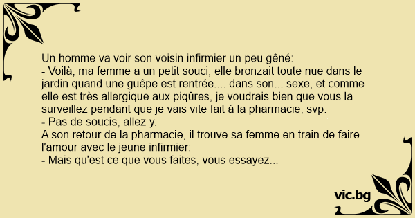 - Voilà, ma femme a un petit souci, elle bronzait toute nue dans le jardin quand une guêpe est rentrée.... dans son... sexe, et comme elle est très allergique aux piqûres, je voudrais bien que vous la surveillez pendant que je vais vite fait à la pharmacie, svp.