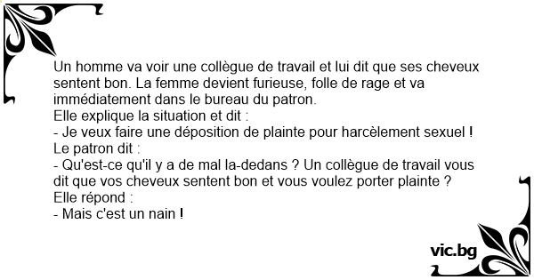Une employée de bureau, en minijupe, va voir son directeur et lui dit, furieuse : - Monsieur le directeur, je viens me plaindre de mon collègue, Maurice, pour harcèlement sexuel ! - Eh bien,...