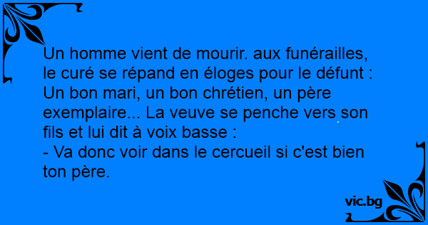 Un homme vient de mourir. aux funérailles, le curé se répand en éloges pour le défunt : Un bon mari, un bon chrétien, un père exemplaire... La veuve se penche vers son fils et lui dit à voix basse : - Va donc voir dans le cercueil si c'est bien ton père.