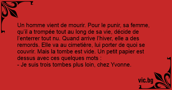 Un homme vient de mourir. Pour le punir, sa femme, qu’il a trompée tout au long de sa vie, décide de l’enterrer tout nu. Quand arrive l’hiver, elle a des remords. Elle va au cimetière, lui porter de quoi se couvrir. Mais la tombe est vide. Un petit papier est dessus avec ces quelques mots :