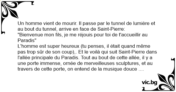 Un homme vient de mourir. Il passe par le tunnel de lumière et au bout du tunnel, arrive en face de Sаinт-Pierre: