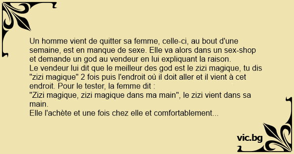 Elle l'achète et une fois chez elle et comfortablement installée, elle dit "Zizi magique, zizi magique entre mes jambes" et profite de ce plaisir. C'est alors que quelqu'un sonne, la femme prend donc le temps de se rhabiller, etc. Arrivée à la porte, c'était le facteur, celui-ci dit :