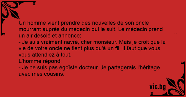 Un homme vient prendre des nouvelles de son oncle mourrant auprès du médecin qui le suit. Le médecin prend un air désolé et annonce: