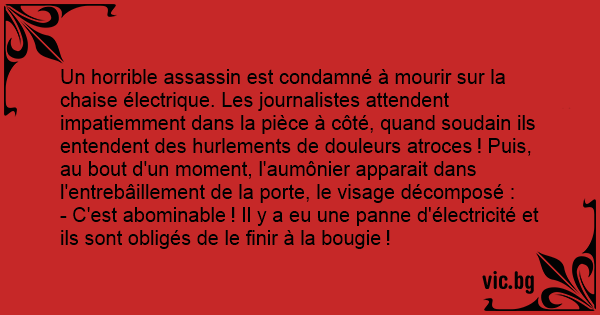 Un horrible assassin est condamné à mourir sur la chaise électrique. Les journalistes attendent impatiemment dans la pièce à côté, quand soudain ils entendent des hurlements de douleurs atroces ! Puis, au bout d'un moment, l'aumônier apparait dans l'entrebâillement de la porte, le visage décomposé :