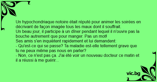 - Non, ce n'est pas ça. J'ai été voir un nouveau docteur ce matin et il a réussi à me guérir de tous mes sujets de conversation.