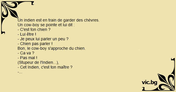 Een cowboy komt een dorpje binnen en ziet een indiaan aan de rand van zijn huis zitten. Cowboy: "Leuke hond heb je. Vind je het erg als ik met hem praat?" Indiaan: "Hond niet praten." Cowboy:...