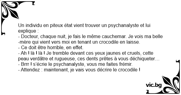 - Docteur, chaque nuit, je fais le même cauchemar. Je vois ma belle-mère qui vient vers moi en tenant un crocodile en laisse.