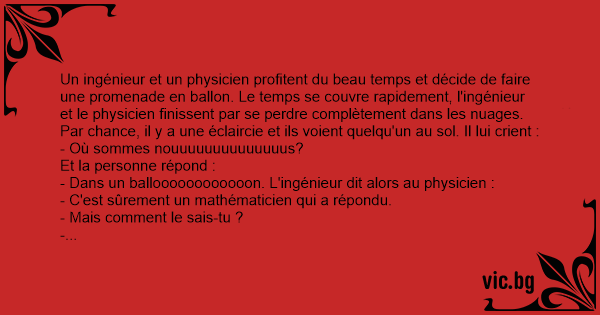 Orientierung in einem Heissluftballon Mit dem Ballon verirrt Marketing Ο Διευθυντής Шерлок Холмс и доктор Уотсън летели с балон. Човек, летящ на въздушен балон, установил, че се е загубил. Ο κομπιουτεράς και ο μάνατζερ Воздушный шар сбился с курса, и воздухоплаватель срочно опустился с ним вниз. A man flying in a hot air balloon suddenly realizes he’s lost. He reduces height and spots a man down below. Un hombre está volando en un globo aerostático y se da cuenta de que se encuentra perdido. Mientras hace algunas maniobras ve a un tipo caminando por el campo. El hombre hace descender el globo algunos metros y grita: - Perdone, ¿me puede decir dónde estoy?. A lo que el hombre que está abajo... George and Harry out in a hot air balloon to cross the Atlantic Ocean. After 37 hours in the air, George says "Harry, we better lose some altitude so we can see where we are". Harry let's out some of the hot air in the balloon, and the balloon descends to below the cloud cover. George says, "I... Zwei Ballonfahrer haben sich im Nebel mit ihrem Ballon verirrt. Plötzlich taucht im Nebel ein 2. Ballon auf mit einer Person an Bord. Da ruft einer der beiden Verirrten: " Hallo, können Sie uns sagen, wo wir uns befinden?" Der andere Ballonfahrer gibt keine Antwort. Kurz bevor die Ballone ausser... A guy is flying in a hot air balloon and he's lost. So he lowers himself over a field and shouts to a guy on the ground:"Can you tell me where I am, and which way I'm headed?" "Sure! You're at 43 degrees, 12 minutes, 21.2 seconds north; 123 degrees, 8 minutes, 12.8 seconds west. You're at 212... Un tipo va en coche por la carretera y se da cuenta de que está perdido. Se detiene en un arcén y pregunta a un viandante que pasaba por allí: - Oiga, ¿puede ayudarme? He quedado a las seis con unos clientes, llevo dos horas de retraso y no sé dónde estoy. - Por supuesto,le contesta el... , Il y a deux types dans une montgolfière. Le premier demande au second : "Excusez-moi, pouvez-vous me dire où nous sommes ?" Le second réfléchit longtemps, très longtemps avant de dire : "Eh... Uma vez um homem viajava em um balão de ar quente quando descobriu que estava totalmente perdido. Visto que sua situação era desesperadora, resolveu diminuir velocidade, e a sua altitude para ver... Un tipo volaba en globo, de pronto se percató que estaba perdido, maniobró y descendió un poco. Divisó a un hombre abajo en la calle, bajó más y le grito: ¡Disculpe! ¿Podría usted ayudarme?... En man i en varmluftsballong insåg att han kommit vilse. Han minskade höjden och såg en kvinna nere på marken. Han sänkte sig ytterligare ner och ropade: - Ursäkta, kan du hjälpa mig? Jag hade... Un uomo su un pallone aerostatico finisce su un albero in mezzo alle campagne in una zona desolata. Passa di li' una persona, allora l'uomo sul pallone gli chiede: - Scusi, mi sa dire dove ci... A woman in a hot air balloon realized she was lost. She reduced altitude and spotted a man below. She descended a bit more and shouted, "Excuse me, can you help me? I promised a friend I would... Um homem voando num balão percebe que estava perdido. Ao ver alguém lá embaixo, resolve descer um pouco para perguntar. Quando está suficientemente baixo, grita: — Hei! Você ai! Pode me dizer onde... Adamın biri balona binmiş ve uçarken yolunu kaybedip bilmediği bir yerde bir çayıra doğru sürüklenmiş. Balonun aşağıda çok yaklaştığı bir sırada aşağıda birini görmüş ve sormuş: - Kayboldum, nerede... Ο φίλοι κάνουν ένα ταξίδι με αερόστατο. Κάποια στιγμή αρχίζει να βρέχει. Σε πολύ λίγο η βροχή γίνεται καταιγίδα και το αερόστατο κομμάτια. Πυξίδες και χάρτες χάνονται. Οι δύο φίλοι κρατιούνται από...