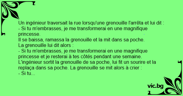 L'ingénieur sortit la grenouille de sa poche, lui fit un sourire et la replaça dans sa poche. La grenouille se mit alors à crier :