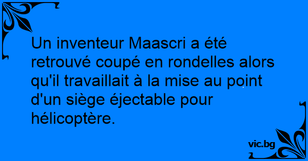 Un inventeur Maascri a été retrouvé coupé en rondelles alors qu'il travaillait à la mise au point d'un siège éjectable pour hélicoptère.