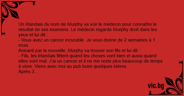 C'est un gars très malade. Son fils l'emmène à la consultation à l'hôpital. Là, après les examens divers et variés, le spécialiste en mauvaises nouvelles lui annonce qu'il est en train de mourir du...
