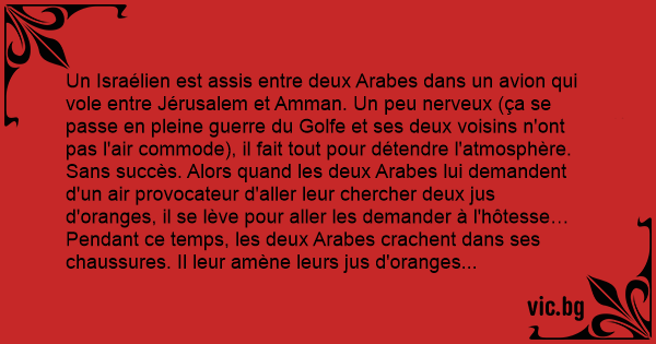 Un Israélien est assis entre deux Arabes dans un avion qui vole entre Jérusаlем et Amman. Un peu nerveux (ça se passe en pleine guerre du Golfe et ses deux voisins n'ont pas l'air commode), il fait tout pour détendre l'atmosphère. Sans succès. Alors quand les deux Arabes lui demandent d'un air provocateur d'aller leur chercher deux jus d'oranges, il se lève pour aller les demander à l'hôtesse… Pendant ce temps, les deux Arabes crachent dans ses chaussures. Il leur amène leurs jus d'oranges et le reste du vol se passe sans aucun problème. Quand l'avion commence à s'approcher de sa destination, l'Israélien remet ses chaussures et sent l'infâme bave qui traverse le tissu et lui mouille la peau. Il se tourne vers l'un de ses voisins : - Vous savez, si l'on veut qu'un jour le Moyen-Orient soit en paix, il faudra que les Arabes arrêtent de cracher dans les chaussures des Israéliens et que les Israéliens arrêtent de рissеr dans les jus d'oranges des Arabes…