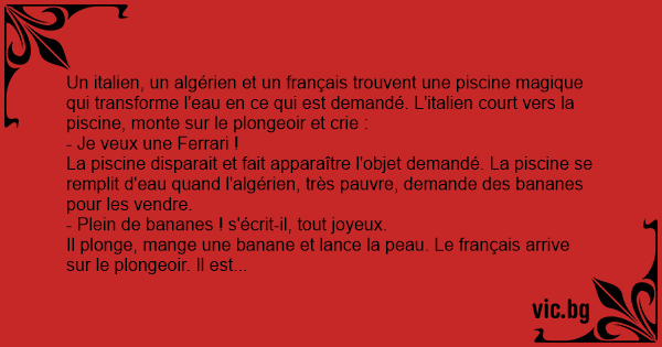Un italien, un algérien et un français trouvent une piscine magique qui transforme l'eau en ce qui est demandé. L'italien court vers la piscine, monte sur le plongeoir et crie :