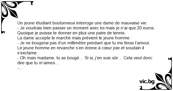 - Je voudrais bien passer un moment avec toi mais je n’ai que 20 euros. Quoique je puisse te donner en plus une paire de tennis.
