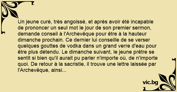 Un jeune curé, très angoissé, et après avoir été incapable de prononcer un seul mot le jour de son premier sermon, demande conseil à l'Archevêque pour être à la hauteur dimanche prochain. Ce dernier lui conseille de se verser quelques gouttes de vоdка dans un grand verre d'eau pour être plus détendu. Le dimanche suivant, le jeune prêtre se sentit si bien qu'il aurait pu parler n'importe où, de n'importe quoi. De retour à la sacristie, il trouve une lettre laissée par l'Archevêque, ainsi rédigée :