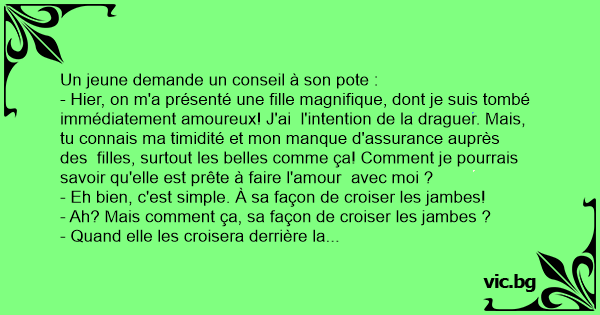 - Hier, on m'a présenté une fille magnifique, dont je suis tombé immédiatement amoureux! J'ai l'intention de la draguer. Mais, tu connais ma timidité et mon manque d'assurance auprès des filles, surtout les belles comme ça! Comment je pourrais savoir qu'elle est prête à faire l'amour avec moi ?