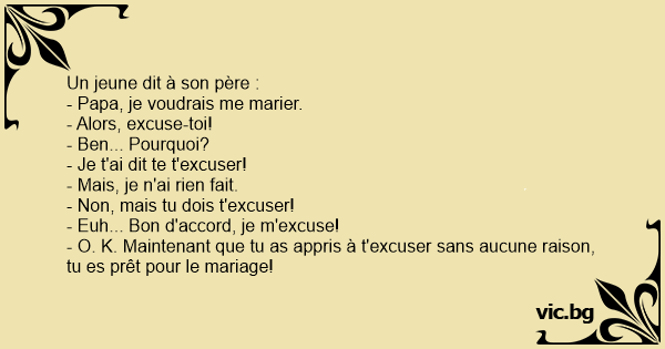 - Papa, je veux me marier! - Excuse-toi! - Mais pourquoi? - Excuse-toi! - Je n'ai rien fait, cela n'a aucun sens?! - Excuse-toi! - Bon ok. Je m'excuse... - Parfait. Maintenant que tu as appris à t'excuser sans aucune raison, tu es prêt à te marier.