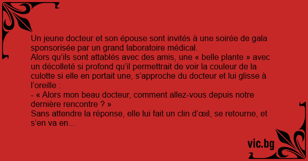 Alors qu’ils sont attablés avec des amis, une « belle plante » avec un décolleté si profond qu’il permettrait de voir la couleur de la culotte si elle en portait une, s’approche du docteur et lui glisse à l’oreille :