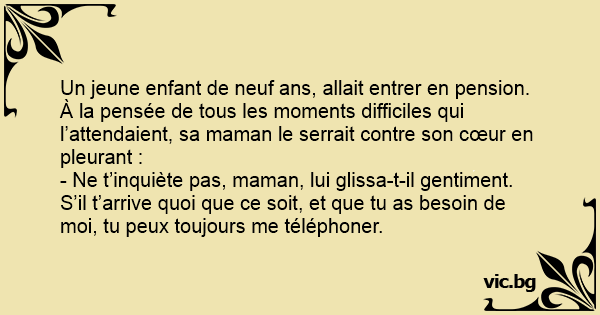 Un jeune enfant de neuf ans, allait entrer en pension. À la pensée de tous les moments difficiles qui l’attendaient, sa maman le serrait contre son cœur en pleurant :