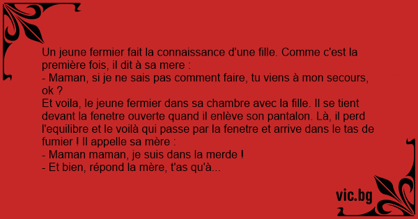 Et voila, le jeune fermier dans sa chambre avec la fille. Il se tient devant la fenetre ouverte quand il enlève son pantalon. Là, il perd l'equilibre et le voilà qui passe par la fenetre et arrive dans le tas de fumier ! Il appelle sa mère :
