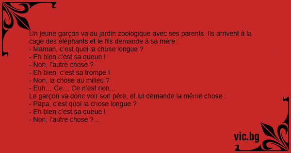 Un jeune garçon va au jardin zoologique avec ses parents. Ils arrivent à la cage des éléphants et le fils demande à sa mère :