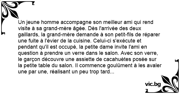 Un jeune homme accompagne son meilleur ami qui rend visite à sa grand-mère âgée. Dès l'arrivée des deux gaillards, la grand-mère demande à son petit-fils de réparer une fuite à l'évier de la cuisine. Celui-ci s'exécute et pendant qu'il est occupé, la petite dame invite l'ami en question à prendre un verre dans le salon. Avec son verre, le garçon découvre une assiette de cacahuètes posée sur la petite table du salon. Il commence goulûment à les avaler une par une, réalisant un peu trop таrd qu'il a fini l'assiette. Au moment, de prendre congé, il remercie chaleureusement la grand-mère de son ami :