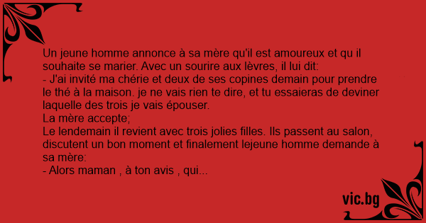 - J'ai invité ma chérie et deux de ses copines demain pour prendre le thé à la maison. je ne vais rien te dire, et tu essaieras de deviner laquelle des trois je vais épouser.
