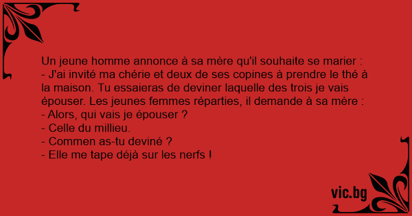 - J'ai invité ma chérie et deux de ses copines à prendre le thé à la maison. Tu essaieras de deviner laquelle des trois je vais épouser. Les jeunes femmes réparties, il demande à sa mère :