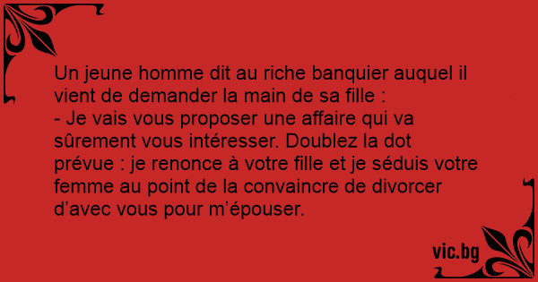 - Je vais vous proposer une affaire qui va sûrement vous intéresser. Doublez la dot prévue : je renonce à votre fille et je séduis votre femme au point de la convaincre de divorcer d’avec vous pour m’épouser.