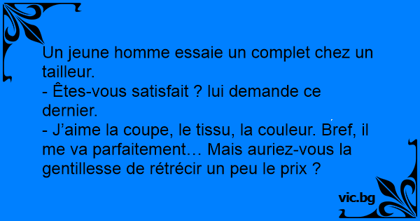- J’aime la coupe, le tissu, la couleur. Bref, il me va parfaitement… Mais auriez-vous la gentillesse de rétrécir un peu le prix ?
