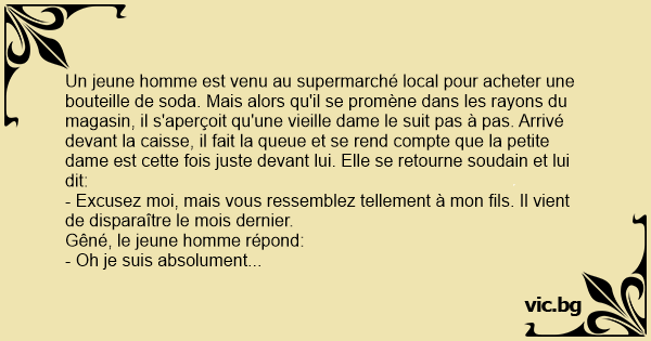 Un jeune homme est venu au supermarché local pour acheter une bouteille de soda. Mais alors qu'il se promène dans les rayons du magasin, il s'aperçoit qu'une vieille dame le suit pas à pas. Arrivé devant la caisse, il fait la queue et se rend compte que la petite dame est cette fois juste devant lui. Elle se retourne soudain et lui dit: